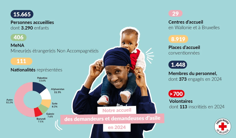 Depuis plus de 35 ans, la Croix-Rouge de Belgique est mandatée par l’État pour accueillir les personnes qui demandent la protection internationale à notre pays. En 2024, nous avons accueilli 15.665 d’entre elles dans 29 centres répartis en Wallonie et à Bruxelles. Au-delà des chiffres, ce sont surtout des parcours de vie, l’histoire d’Amadou ou de Djaka que la Croix-Rouge écoute, accompagne et oriente. 1.448 membres salariés et plus de 700 volontaires se sont mobilisés pour leur fournir un accueil digne et humain chaque jour et chaque nuit.